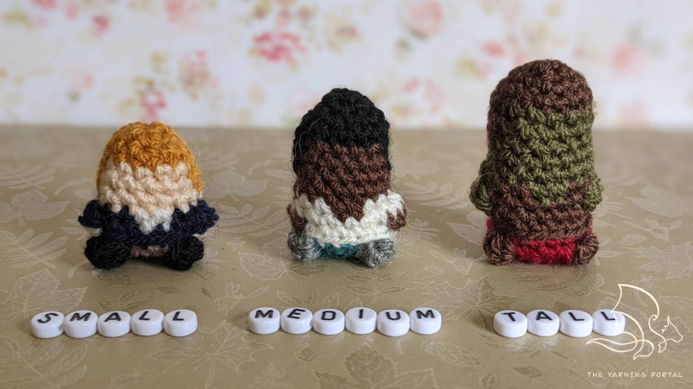 If crocheted with a 3.5mm hook, DK yarn, and tight tension, these adventurers can squeeze into a inch x inch grid alongside your other minis.